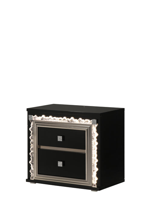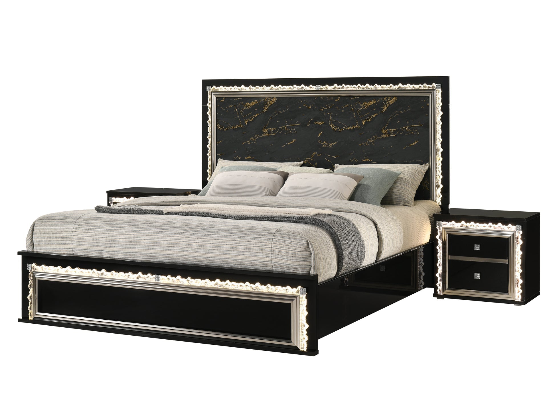 Features Modern luxury design with bold black finish, Integrated LED lighting for ambient elegance, Marble-inspired headboard accent panel, Crystal-style trim and hardware detailing, Spacious storage with smooth-glide drawers and Complete coordinated bedroom set available.