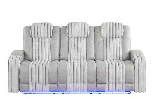 Discover Empires Transformer in sleek grey, designed for comfort and modern living. The sofa features a power recliner and headrest, a convenient dropdown table with reading light, LED lighting, and storage arms for practical use. The loveseat offers power recline and headrest, integrated speakers, LED lighting, and storage arms to elevate your relaxation experience. The recliner delivers power recline and headrest alongside subtle LED lighting, creating a perfect spot to unwind. Upgrade your home with these stylish, technology-rich pieces that blend comfort and innovation seamlessly.