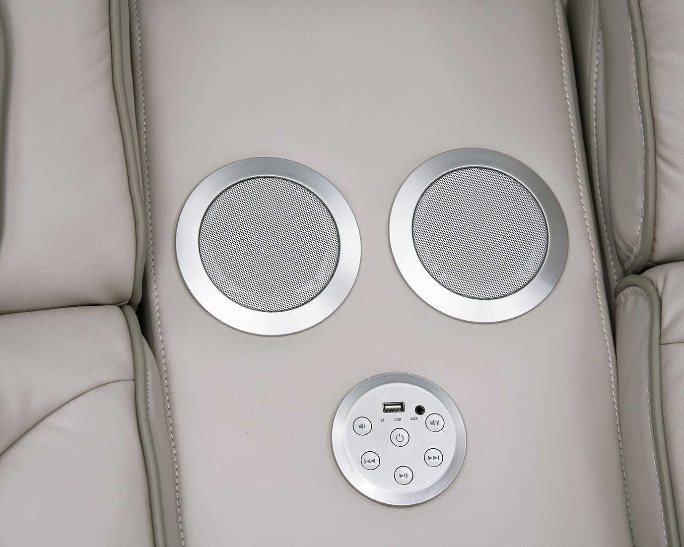 Loveseat: Power reclining with power headrest, storage arm with cupholders, console with Bluetooth speakers, LED base and arms, and USB charging ports.